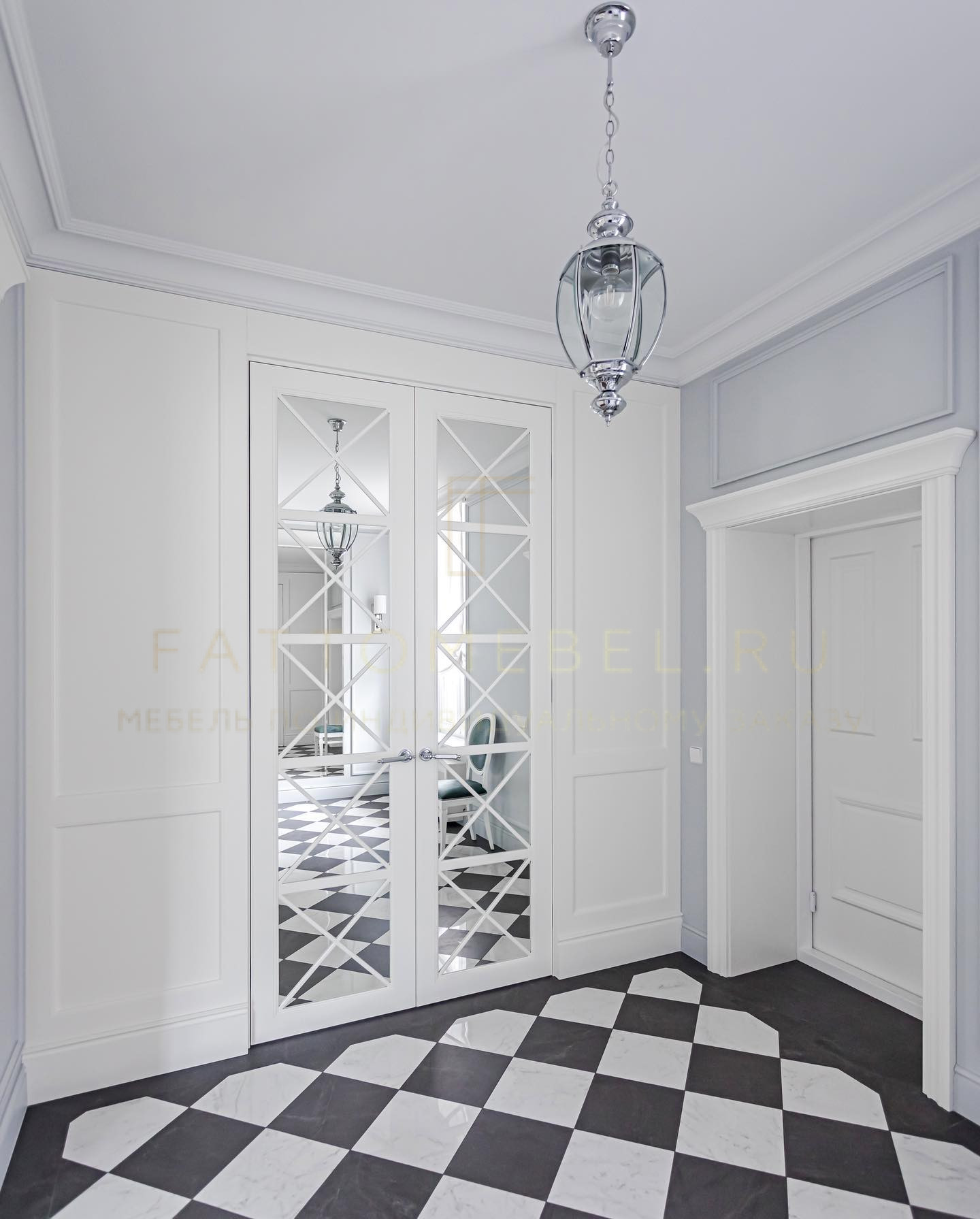 Реализовываем любое ваше решение. За стеклянными дверями скрыта большая гардеробная. Правая и левая створки стационарные (не открываются), они закрывают стену.