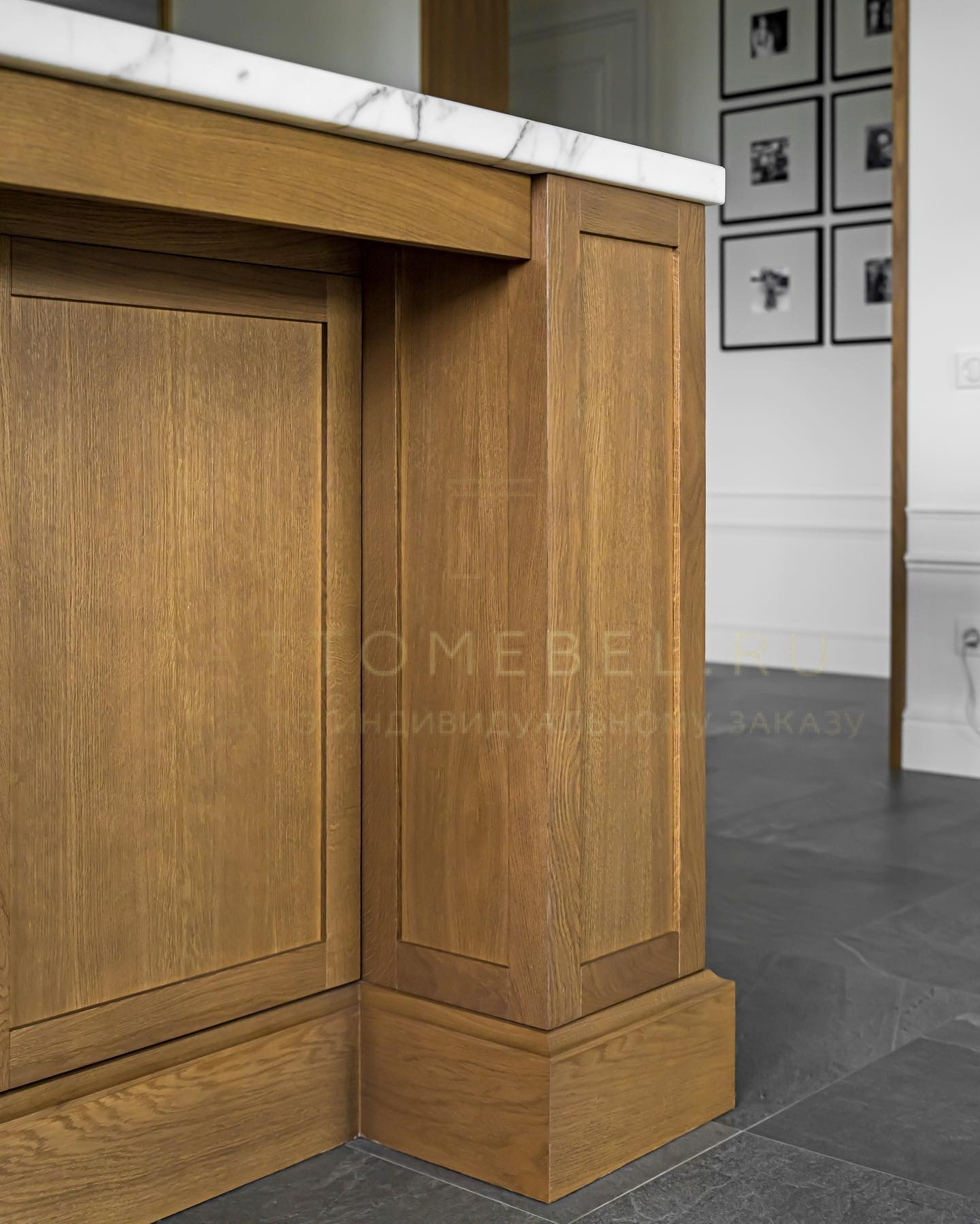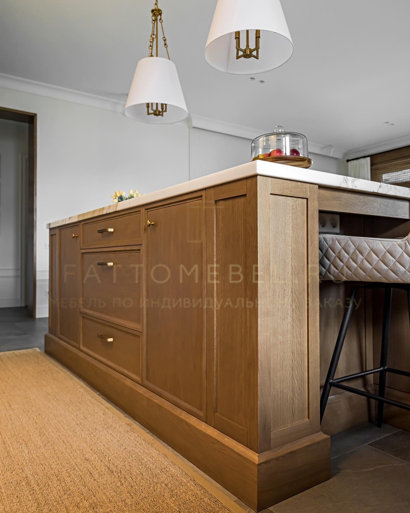 Фасады изготовлены из массива дуба, подобранного по текстуре рисунка, по длине и ширине. Резьба на кухне выполнена вручную нашими краснодеревщиками, по заранее сделанному и утверждённому с клиентом эскизу. Фурнитура использована концерна Blum и VAUTH-SAGEL.
