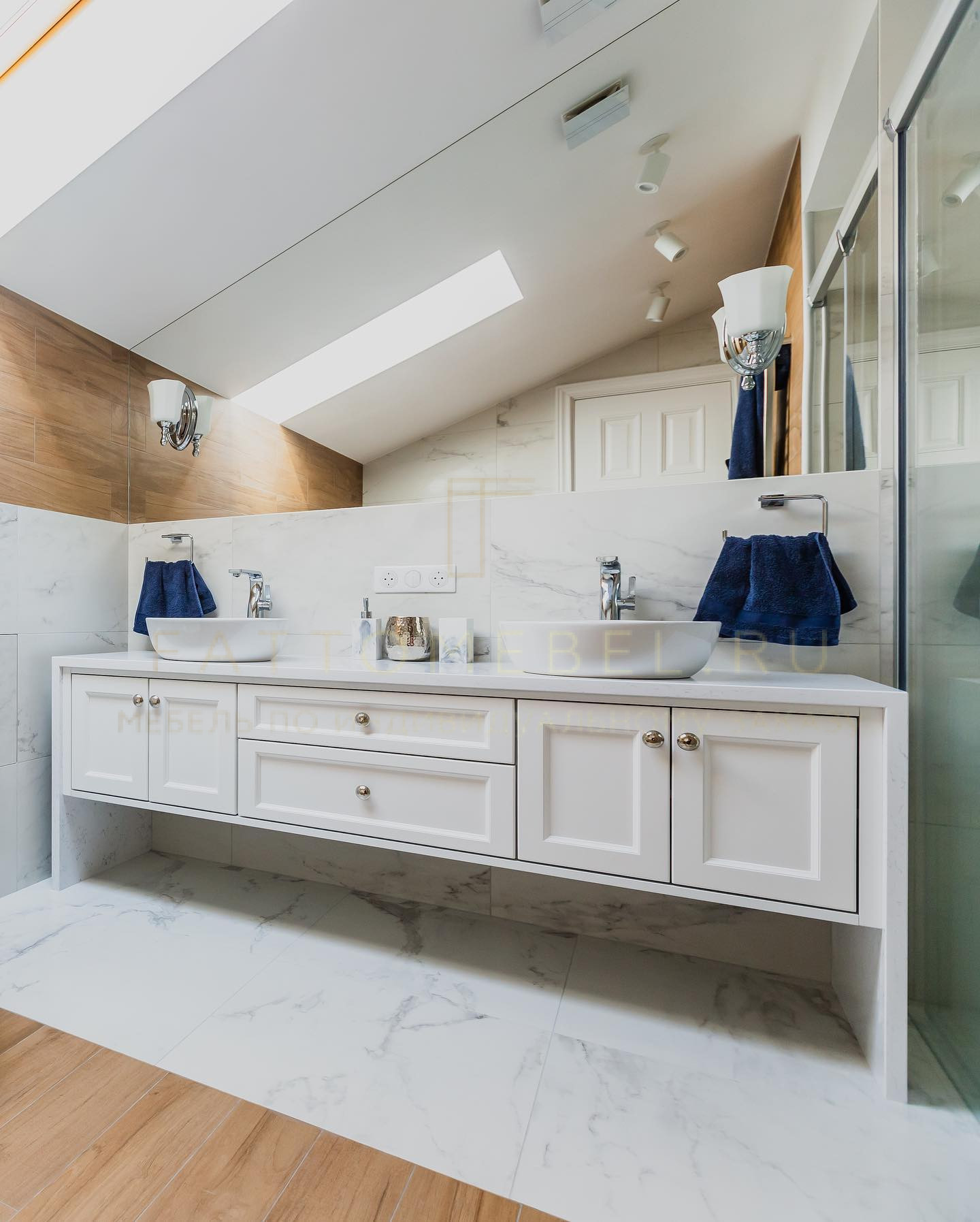 Мебель для ванных комнат — тумба, шкаф. Мы всегда делаем мебель в ванную только из влагостойкого МДФ, а электрика вся низковольтная.